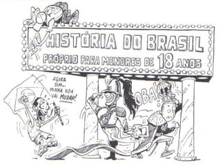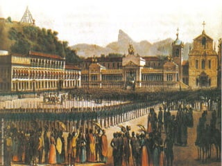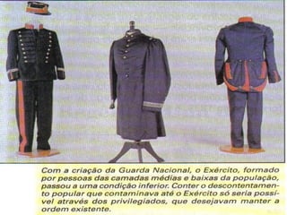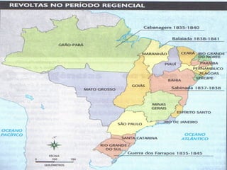 O documento descreve o Período Regencial no Brasil (1831-1840) após a saída de D. Pedro I. Foi estabelecida uma junta governativa tríplice e surgiram três grupos políticos principais. O país passou por quatro regências diferentes até que D. Pedro II assumiu o poder em 1840 aos 14 anos, encerrando o Período Regencial.