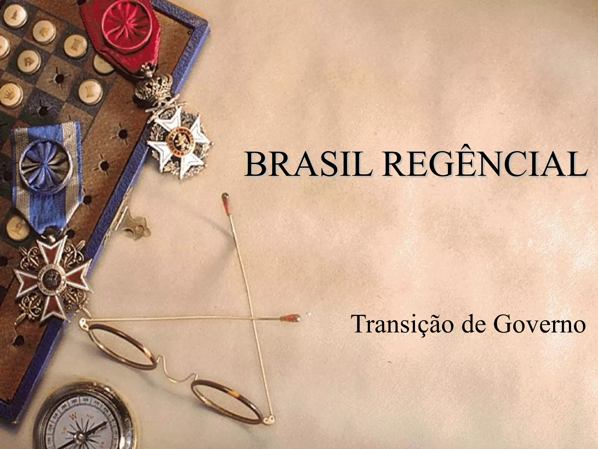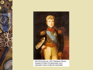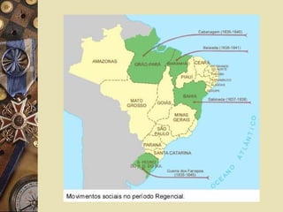 O documento resume o período regencial do Brasil após a abdicação de D. Pedro I em 1831, caracterizando as diferentes regências provisória e trinas, as revoltas que ocorreram como a Cabanagem, Balaiada e Sabinada, e o Golpe da Maioridade que antecipou a maioridade de D. Pedro II em 1840, encerrando o período regencial.