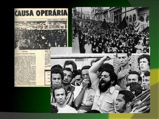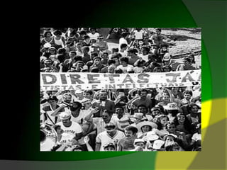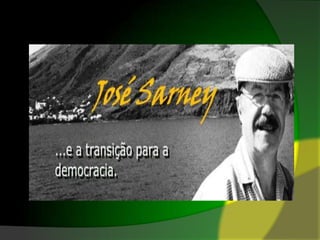 O documento descreve a transição democrática no Brasil após o regime militar, com a eleição indireta de Tancredo Neves como primeiro presidente civil desde 1964. Devido a problemas de saúde, José Sarney assumiu interinamente e depois permanentemente a presidência. Seu governo foi marcado por altas taxas de inflação e tentativas fracassadas de controlá-la através de planos econômicos como o Plano Cruzado e o Plano Bresser. Também promulgou-se a nova Constituição de 1988.