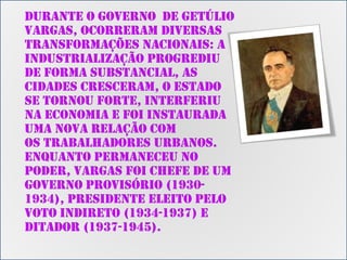 Durante o governo de Getúlio Vargas, o Brasil passou por diversas transformações como a industrialização, crescimento das cidades e fortalecimento do Estado. Vargas governou de 1930 a 1954 de forma provisória, eleito e como ditador, modernizando a nação mas de forma conturbada, até supostamente cometer suicídio após pressões políticas. Vargas foi uma figura central na política brasileira do século XX.