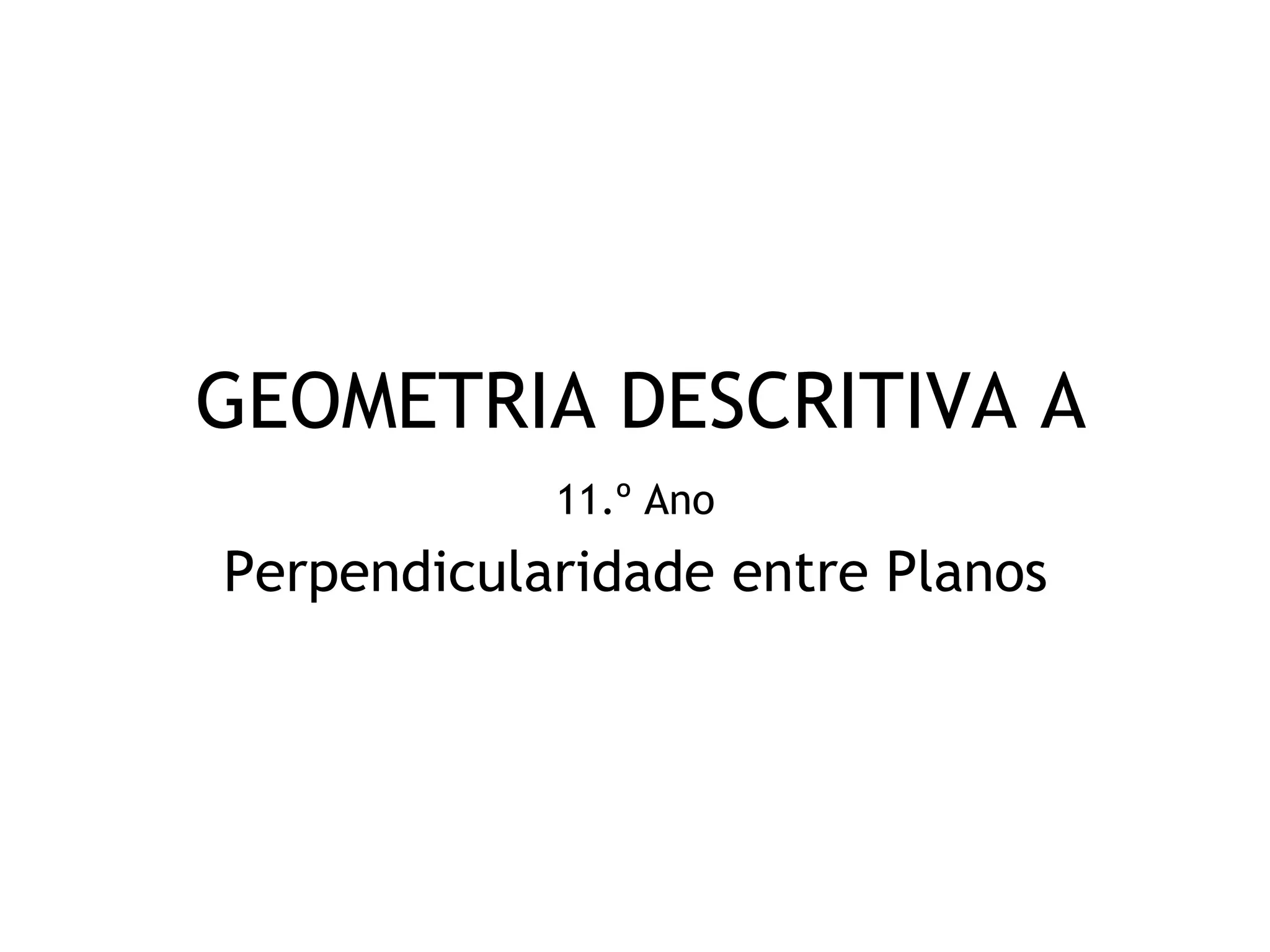 Este documento descreve os conceitos de perpendicularidade entre planos em geometria descritiva. Explica que um plano é perpendicular a outro se contiver uma reta perpendicular a esse outro plano. Detalha como determinar os traços de planos perpendiculares a planos oblíquos, bissectores e planos horizontais.