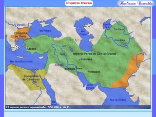 O documento descreve a história do antigo Império Persa, desde sua fundação por Ciro, o Grande até sua queda, abordando aspectos como a expansão territorial, a administração imperial, a religião zoroastriana e vestígios arqueológicos remanescentes.