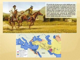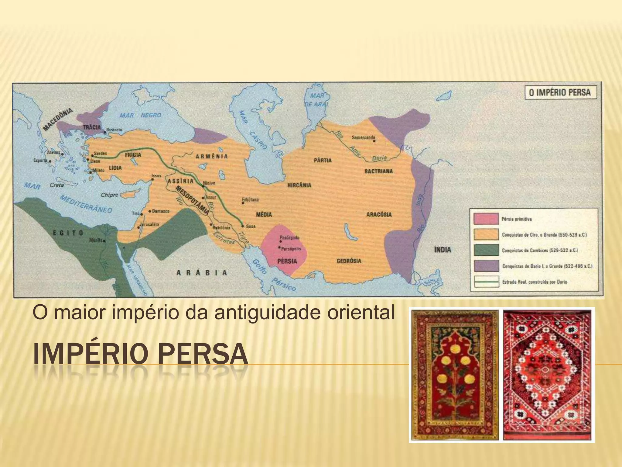 O Império Persa foi o maior império do Oriente Antigo, unificando diversos povos e se estendendo do Mar Mediterrâneo ao Oceano Índico. Sob o governo de Ciro, Dario I e seus sucessores, implementaram uma administração centralizada com satrápias e um sistema de abastecimento militar, além de um eficiente sistema de correios e moeda. A religião predominante, o zoroastrismo, introduziu a luta entre o bem e o mal, e serviu como um meio de controle social e político na sociedade persa.