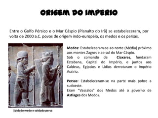 O Império Persa, formado por medos e persas, surgiu por volta de 2000 a.C. e se consolidou sob Ciro, o Grande, que unificou tribos do planalto iraniano e conquistou vastas áreas, incluindo a Babilônia. Ao longo do tempo, vários governantes, como Dario I e Xerxes I, expandiram e administraram o império, enfrentando desafios como as Guerras Greco-Persas e rebeliões internas. A religião persa evoluiu do politeísmo para o zoroastrismo, promovendo um sistema moral e dualista que influenciou a sociedade e a cultura persa, marcada por grandes empreendimentos arquitetônicos e artísticos.