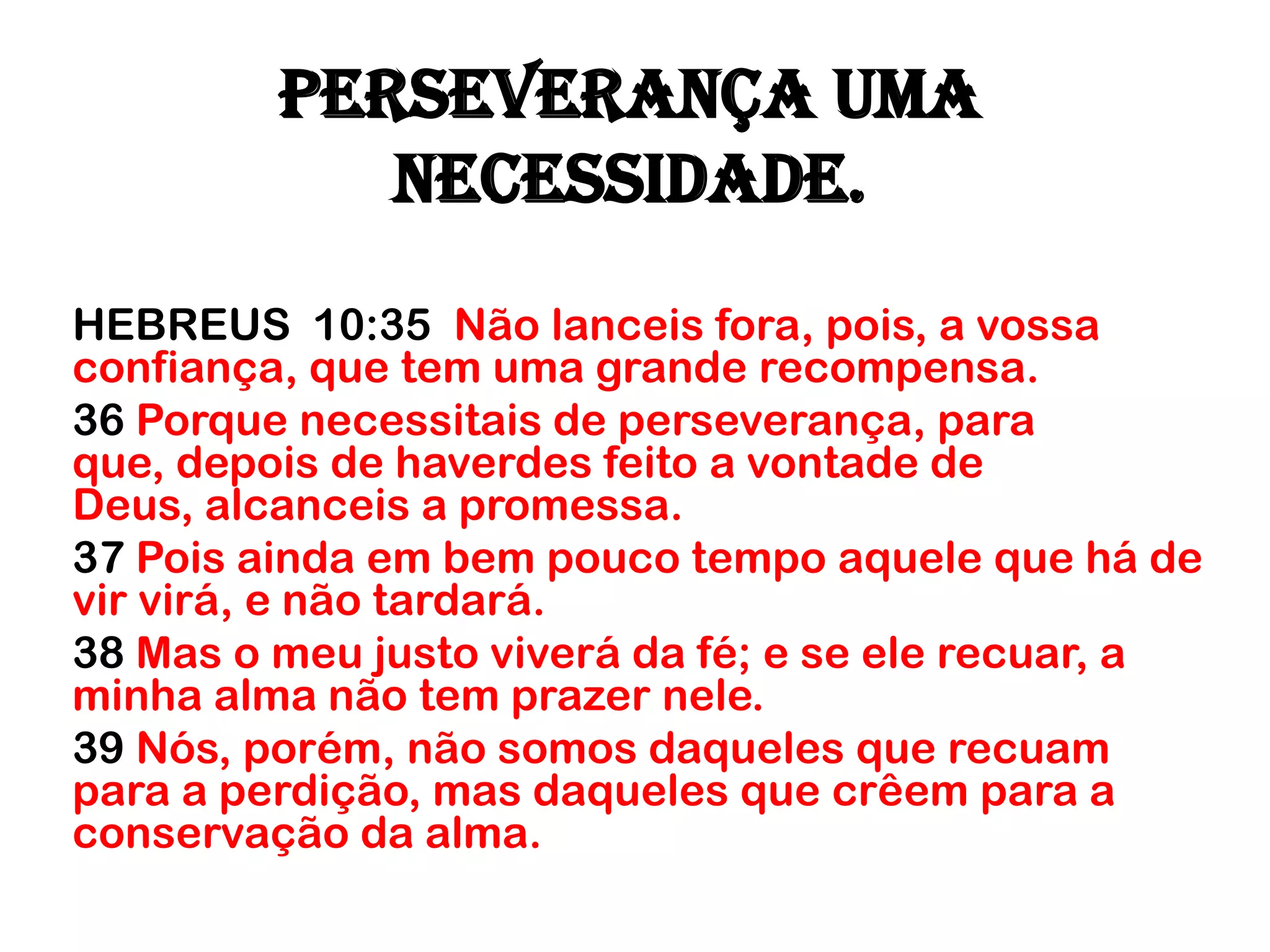 Este documento enfatiza a necessidade da perseverança na fé cristã. Ele cita passagens bíblicas que incentivam os leitores a não desistirem de sua confiança em Deus, mesmo enfrentando dificuldades, e a continuarem perseverando na vontade de Deus para alcançarem as promessas divinas.