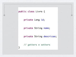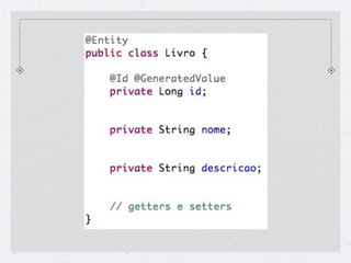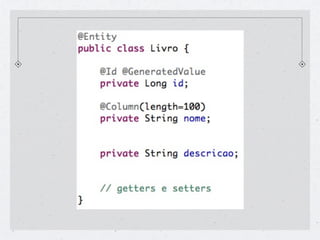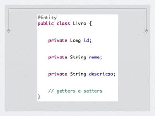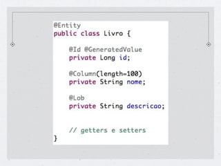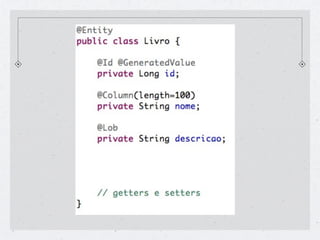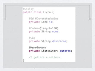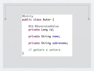 O documento discute as evoluções na persistência de dados em Java, começando pelo acesso direto ao banco de dados via JDBC, depois o uso do Hibernate para mapeamento objeto-relacional e por fim a abstração proporcionada pela especificação JPA.
