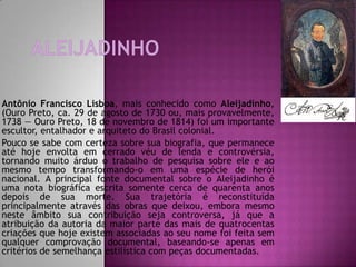 Aleijadinho, um renomado escultor e arquiteto do Brasil colonial, viveu entre 1730 e 1814, e sua biografia é envolta em mistério, com a maioria de suas obras atribuíadas sem comprovação documental. Zumbi dos Palmares, líder do maior quilombo colonial, lutou pela liberdade dos escravos no Brasil até sua morte em 1695. Lima Barreto, jornalista e escritor libertário, nasceu em 1881 e foi influenciado por sua infância marcada pela escravidão e pelo contexto político da época.