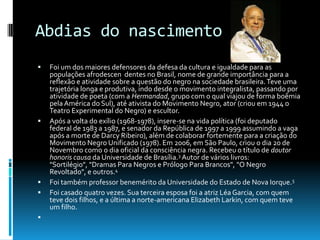 O documento apresenta resumos biográficos de 5 personalidades negras brasileiras: Abdias do Nascimento, Pelé, Luiz Gonzaga, Pixinguinha e Clementina de Jesus. Detalha suas contribuições para a cultura e a sociedade brasileira nos campos da política, do futebol, da música e do samba.