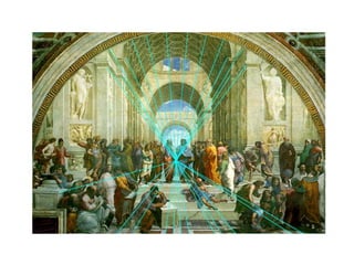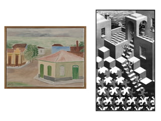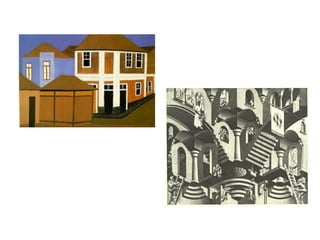 Este documento descreve os elementos e tipos de perspectiva utilizados na representação artística do espaço. A perspectiva cria a ilusão de profundidade usando linhas convergentes. Os elementos chave são a linha do horizonte, ponto de vista e linhas de fuga convergindo para um ou mais pontos de fuga. Há três tipos de perspectiva - paralela (um ponto de fuga), oblíqua (dois pontos) e aérea (três pontos), dependendo da posição do objeto em relação ao observador.
