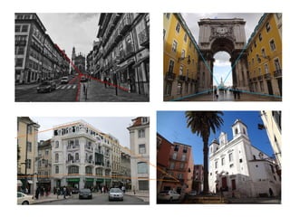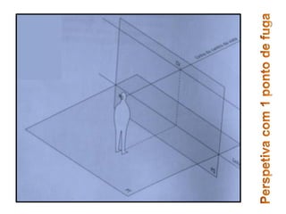 Este documento descreve a perspectiva cônica, um método de representação do espaço através da projeção de objetos em uma superfície plana de forma a preservar a percepção visual da posição e tamanho relativo dos objetos. A perspectiva cônica utiliza um ponto de fuga e pontos métricos para desenhar objetos mantendo a proporção correta conforme a distância do observador. O documento fornece instruções detalhadas para desenhar em perspectiva cônica uma sala com dimensões e elementos especific