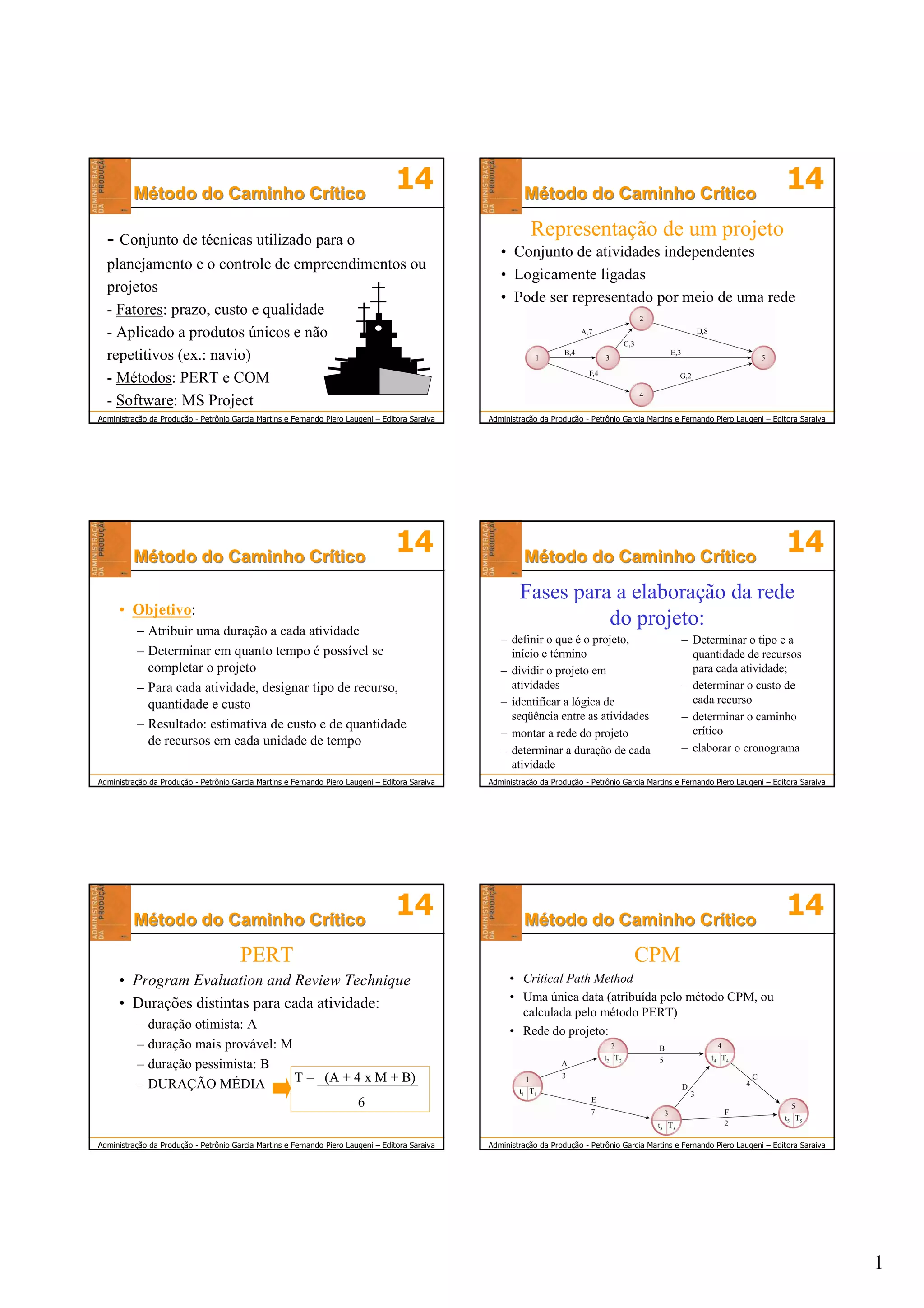 O método do caminho crítico é utilizado para planejar e controlar projetos, representando as atividades e sua lógica de sequência em uma rede. Ele determina a duração mínima de um projeto ao identificar o caminho crítico, formado pelas atividades que não podem ter atrasos. Softwares como o MS Project auxiliam na análise, permitindo a geração de cronogramas e cálculos de recursos e custos.