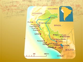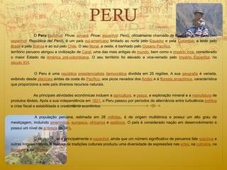 O Peru abrigou importantes civilizações pré-colombianas como os Incas e Caral. Atualmente é uma república presidencialista com economia baseada em agricultura, pesca e mineração. Pontos turísticos notáveis incluem Machu Picchu, Cusco, Lago Titicaca e linhas geoglíficas de Nazca.