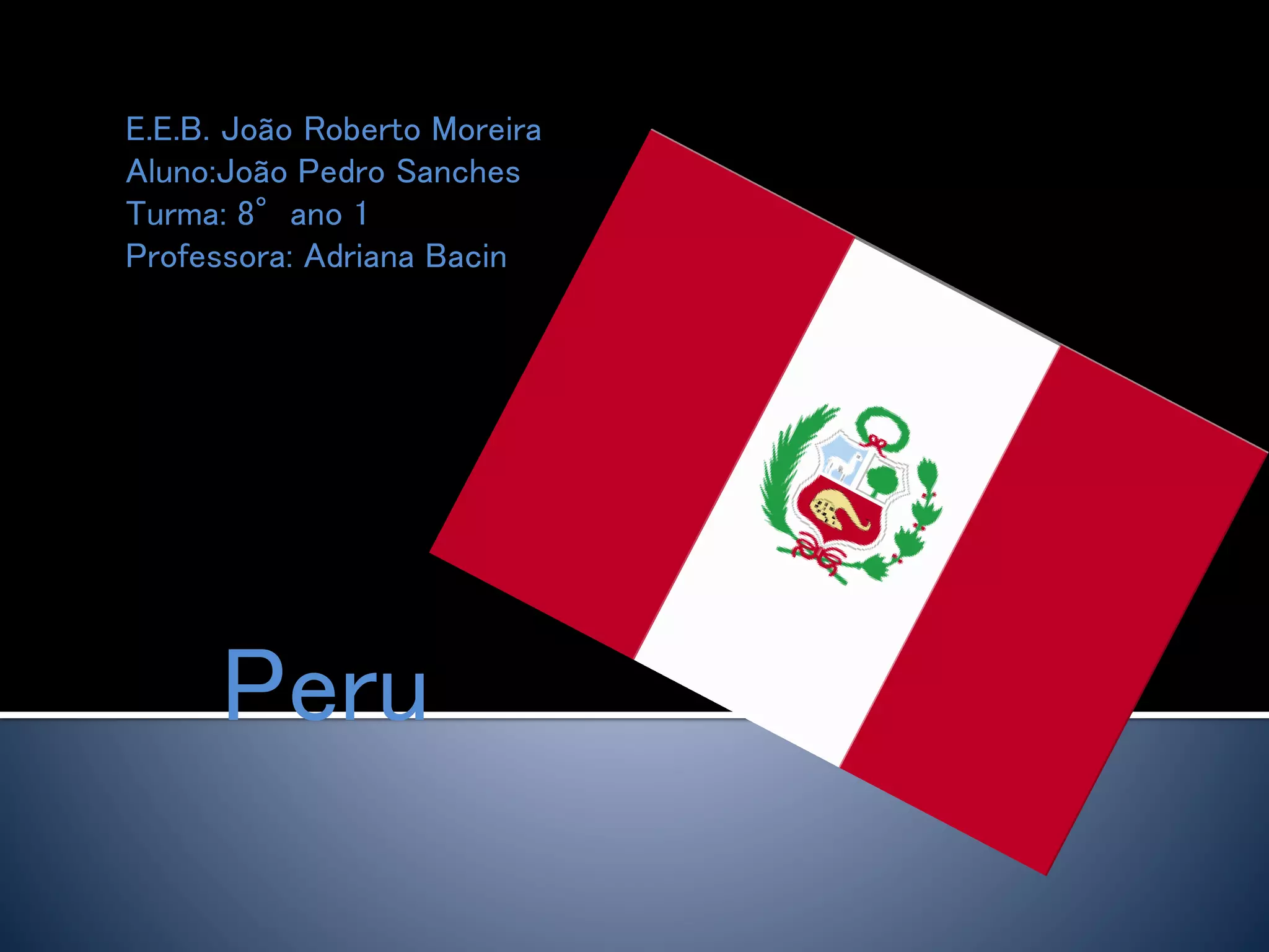 O documento resume informações gerais sobre o Peru, incluindo sua localização, divisões políticas, história, economia, governo e aspectos geográficos e climáticos. Aborda tópicos como a independência do Peru da Espanha em 1821, suas principais cidades e regiões, a composição étnica da população, aspectos da economia como os setores que mais contribuem para o PIB, e detalha a geografia do país, dividida em costa, serra e selva.