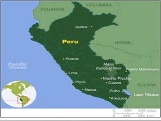 O documento descreve a história, geografia, cultura e curiosidades do Peru. A mais antiga sociedade foi a civilização Caral entre 3000-1800 a.C. Os Incas formaram o maior império da América no século XV. O documento também lista as principais cidades como Lima, Arequipa e Cuzco, além da gastronomia e seleção peruana de futebol.