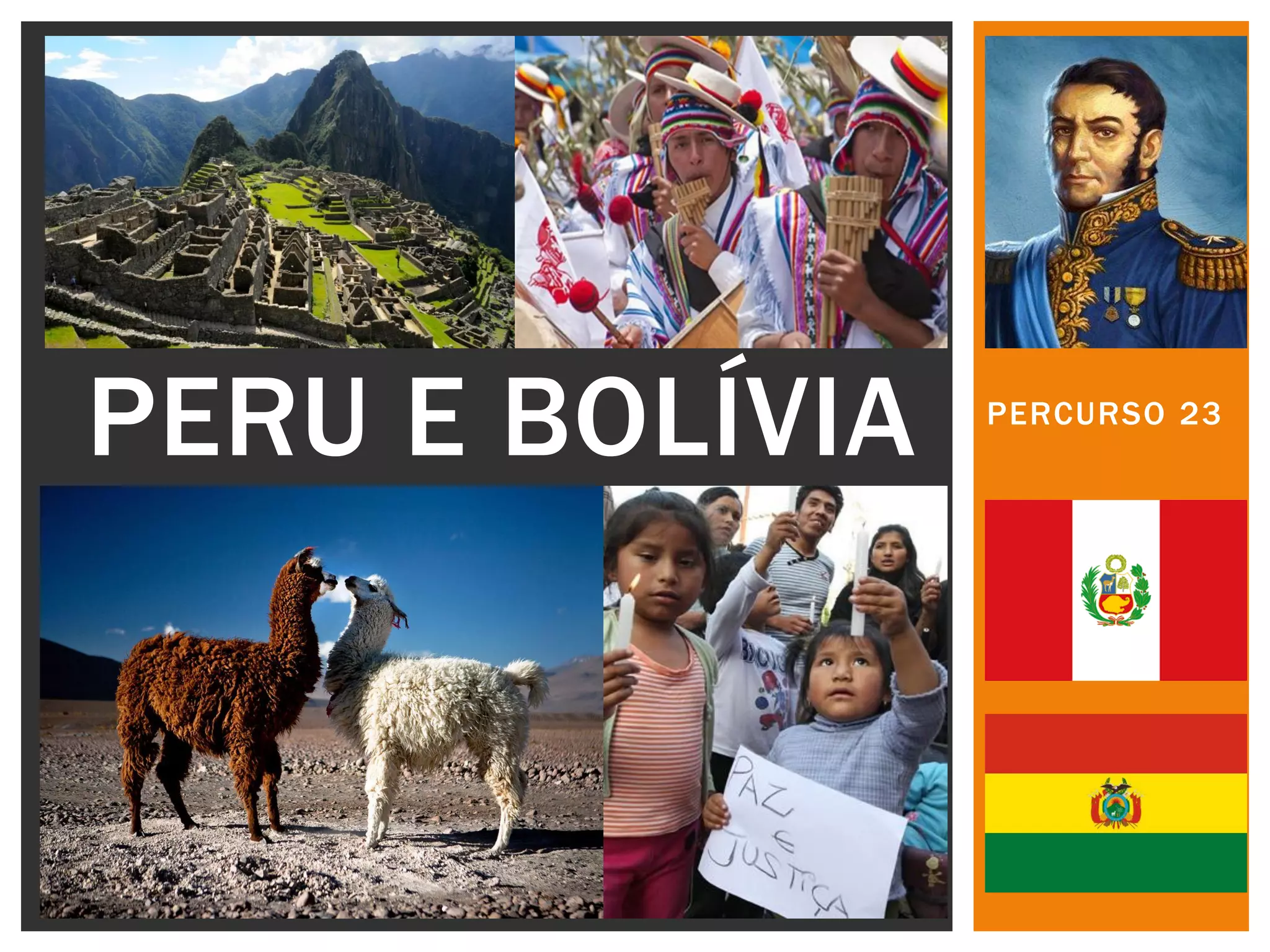 O documento descreve as regiões naturais e aspectos socioeconômicos do Peru e da Bolívia. O Peru possui três regiões naturais (La Costa, La Selva e La Sierra) e a economia baseia-se em recursos minerais, agricultura e pesca. A Bolívia é dividida em regiões andinas e dos Llanos, com economia focada em minerais e gás natural.