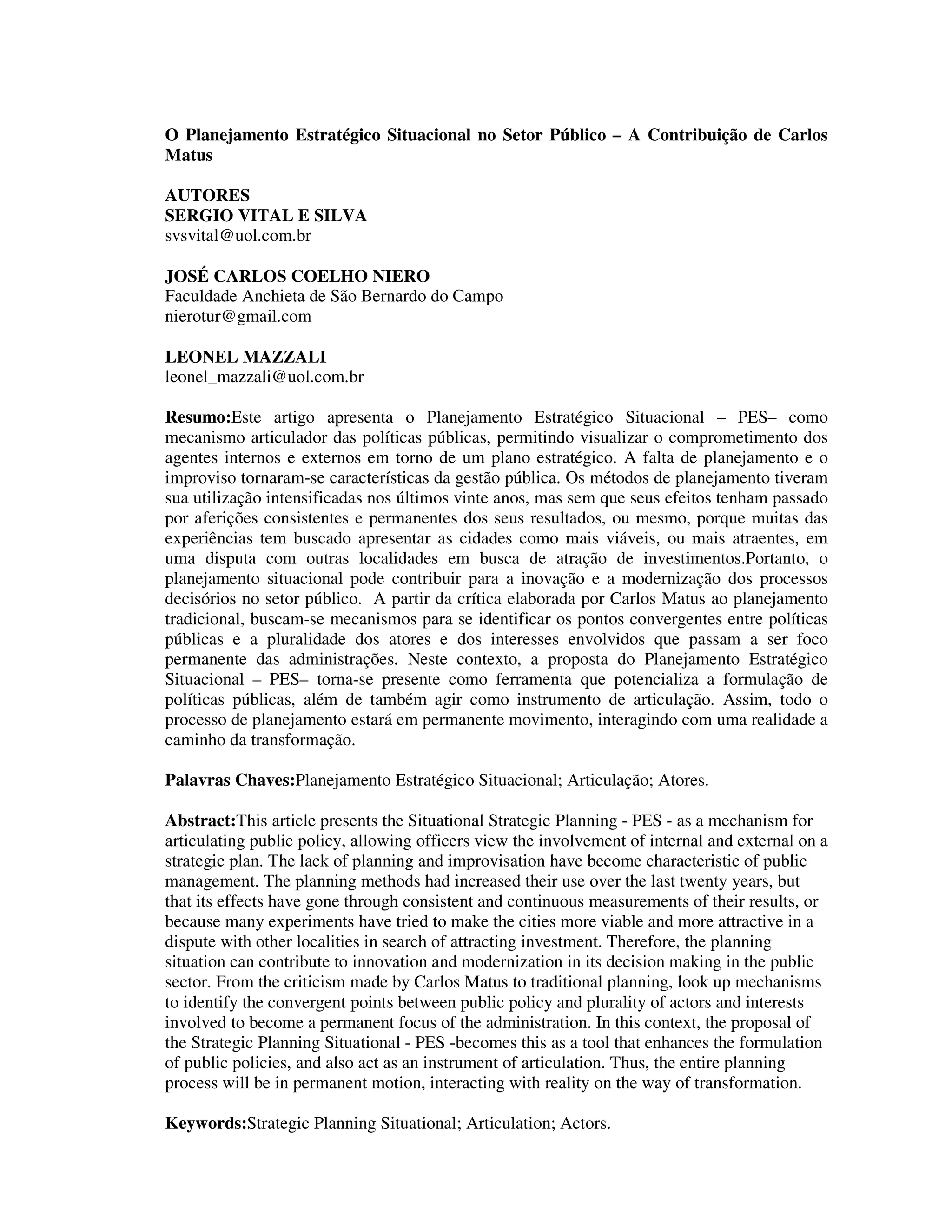 Este artigo discute o Planejamento Estratégico Situacional (PES) proposto por Carlos Matus como um mecanismo para articular políticas públicas e os diversos atores envolvidos. O PES reconhece a incerteza e os conflitos inerentes ao processo de planejamento no setor público. Ele busca identificar os pontos de convergência entre as políticas e os interesses dos diferentes atores, de modo a promover a formulação e implementação coordenada de políticas públicas.