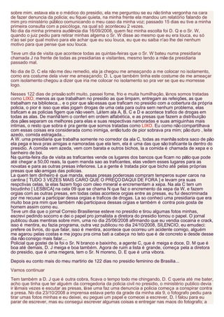 1) A autora relata sua prisão por suposto tráfico de drogas e sua transferência para a prisão feminina de Brasília, onde sofreu maus-tratos, humilhações e tentativas de assassinato por parte de outras presas e negligência médica.