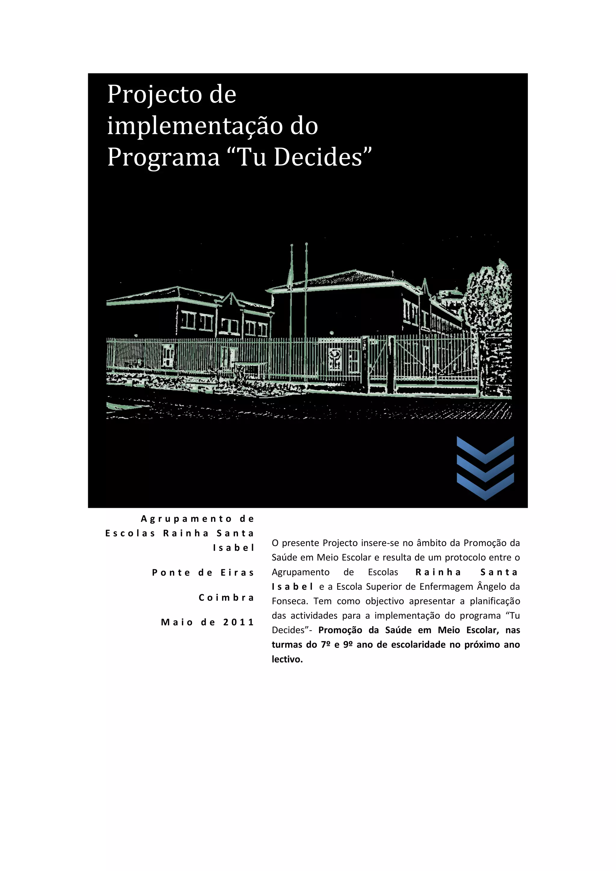 Este documento descreve o projeto de implementação do programa "Tu Decides" numa escola em Portugal. Apresenta um diagnóstico social da comunidade escolar, incluindo sua demografia, economia, educação e necessidades identificadas. O objetivo é promover a saúde e bem-estar dos alunos do 7o e 9o ano através deste programa.