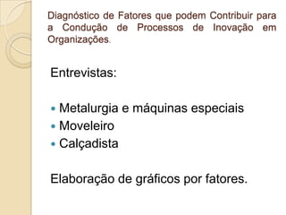 Este documento apresenta os resultados de um questionário aplicado em dez empresas sobre fatores que contribuem para processos de inovação. Foram analisados fatores internos, externos, operacionais, estratégicos, estrutura organizacional e cultura organizacional. De modo geral, concluiu-se que as empresas precisam melhorar em planejamento estratégico, estrutura organizacional formal e incentivo à colaboração e compartilhamento de conhecimento.