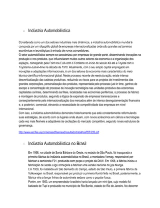 • Indústria Automobilística Consideradacomo um dos setores industriais mais dinâmicos, a indústria automobilística mundial é composta por um oligopólio global de empresas internacionalizadas onde são grandes as barreiras econômicas e tecnológicas à entrada de novos competidores. O setor automobilístico sempre se caracterizou por empresas de grande porte, disseminando inovações na produção e nos produtos, que influenciaram muitos outros setores da economia e a organização dos espaços, começando pela Ford nos EUA com o Fordismo no início do século XX até a Toyota com o Toyotismo-Just-in-time na década de 1970. Atualmente, com o seu amplo capital empregado em inovações e adaptações informacionais, é um dos setores da economia mais característico do meio técnico-científico-informacional global. Neste processo recente de reestruturação, existe intensa desverticalização das cadeias produtivas, reduzindo os riscos para os projetos de investimentos das grandes corporações, personalização dos produtos, representada pelo processo just in time, ganhos de escopo e concentração do processo de inovação tecnológica nas unidades produtiva das economias capitalistas centrais, determinando às filiais, localizadas nas economias periféricas, o processo de fabrico e montagem de produtos, seguindo a lógica de expansão de empresas transnacionais e conseqüentemente pela internacionalização dos mercados além de intensa desregulamentação financeira e, a posteriori, comercial, elevando a necessidade de competitividade das empresas em nível internacional. Com isso, a indústria automobilística demonstra historicamente que está constantemente reformulando suas estratégias, de acordo com os lugares onde atuam, com novos acréscimos em ciência e tecnologias cada vez mais flexíveis e adaptáveis às oscilações do mercado competitivo, segundo novas estruturas de governança. http://www.ead.fea.usp.br/semead/8semead/resultado/trabalhosPDF/226.pdf • Indústria Automobilística no Brasil Em 1956, na cidade de Santa Bárbara do Oeste, no estado de São Paulo, foi inaugurada a primeira fábrica da Indústria automobilística no Brasil, a montadora Vemag, responsável por fabricar a camioneta F91, produzida com peças e projeto da DKW. Em 1958, a fábrica iniciou a fabricação de sedãs.Logo começaria a fabricar uma versão nacional do jipe Munga. Em 1959, foi instalada em São Bernardo do Campo, estado de São Paulo, a primeira fábrica da Volkswagen no Brasil, responsável por produzir a primeira Kombi feita no Brasil, posteriormente, a fábrica viria a lançar linhas de automóveis sedans como o popular fusca. Porém, em 1953, um empreendedor brasileiro havia lançado um mini-jipe, cujo modelo foi batizado de Tupi e produzido no município de Rio Bonito, estado do Rio de Janeiro. No decorrer