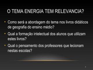 Este documento resume uma pesquisa sobre como o tema da energia é abordado nos livros didáticos do ensino médio em Boa Vista, Roraima. Os principais resultados são: (1) Os livros didáticos abordam o tema de forma insatisfatória e não atendem plenamente aos objetivos de ensino; (2) Os alunos demonstraram ter conhecimentos limitados sobre energia, apesar de serem conscientes sobre energias renováveis; (3) Os professores reconhecem que os livros didáticos não são a principal fon