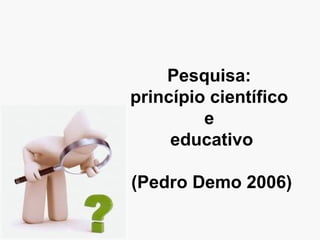 Este documento discute a importância da pesquisa como princípio científico e educativo. Ele argumenta que a pesquisa é essencial para questionar criticamente a realidade, produzir conhecimento de forma criativa e evitar a simples reprodução de ideias. Também afirma que a pesquisa é fundamental para o desenvolvimento de uma consciência crítica e para a construção de uma sociedade mais justa.