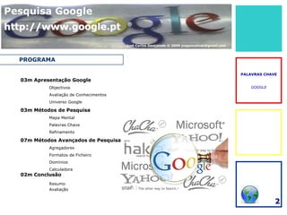 O documento apresenta uma palestra sobre ferramentas de pesquisa no Google. Apresenta o histórico e estatísticas do Google, métodos de pesquisa básicos e avançados utilizando operadores, e exemplos de pesquisas com conversões, horários e voos. O documento contém 16 páginas com informações sobre como realizar pesquisas eficientes no Google.