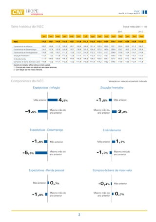O INEC de março de 2022 registrou pequeno aumento da confiança do consumidor na comparação com fevereiro. A maioria dos componentes do INEC variou de 1,5% ou mais na comparação mensal. A expectativa de inflação mostrou o maior crescimento na comparação mensal, enquanto a expectativa de desemprego teve a maior queda.