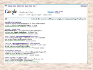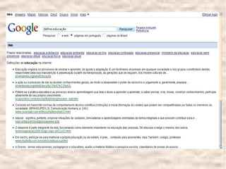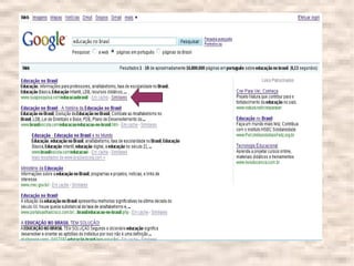 O documento fornece instruções sobre como realizar pesquisas eficientes no Google, incluindo o uso de aspas, sinais de mais e menos, e pesquisa por categoria ou tipo de arquivo. Recomenda também sites para pesquisa acadêmica como o Google Acadêmico, CAPES, SciELO e bancos de teses de universidades brasileiras.
