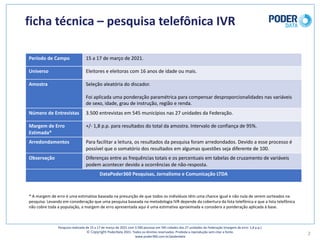 A pesquisa apresenta os resultados de uma pesquisa de opinião pública realizada entre 15 e 17 de março de 2021 com 3.500 entrevistas em 545 municípios brasileiros. Lula aparece na liderança da intenção de voto para presidente no primeiro turno com 34%, seguido por Bolsonaro com 30%. Em um segundo turno entre Lula e Bolsonaro, 41% votariam em Lula e 36% em Bolsonaro. A amostra foi estratificada por sexo, idade, escolaridade, região e renda.
