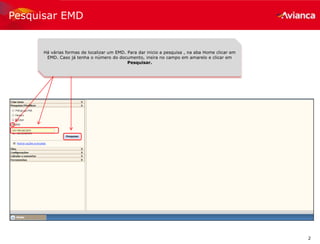 O documento descreve várias formas de localizar um EMD (documento de movimentação eletrônica) no sistema, incluindo pesquisar pelo número do documento, nome do passageiro, telefone, endereço de e-mail, número de passageiro frequente, forma de identificação ou cartão de crédito. Se houver mais de um resultado, o sistema listará todos os documentos e o usuário poderá abrir um específico clicando duas vezes sobre a linha ou selecionando e clicando em "Abrir EMD".