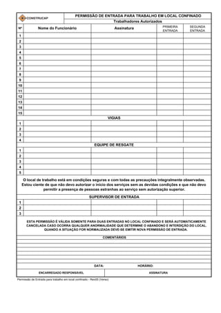 1) O documento é uma permissão de entrada para trabalho em local confinado, que requer a verificação de vários itens de segurança e liberação da atmosfera.