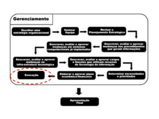 O documento discute a fase de execução do Planejamento Estratégico de Tecnologia da Informação (PETI), identificando suas principais características como a organização e execução de mudanças planejadas, os principais desafios como alinhar TI com metas de negócios e gerar ambiente favorável à estratégia, e as principais barreiras como suporte gerencial e envolvimento de usuários.
