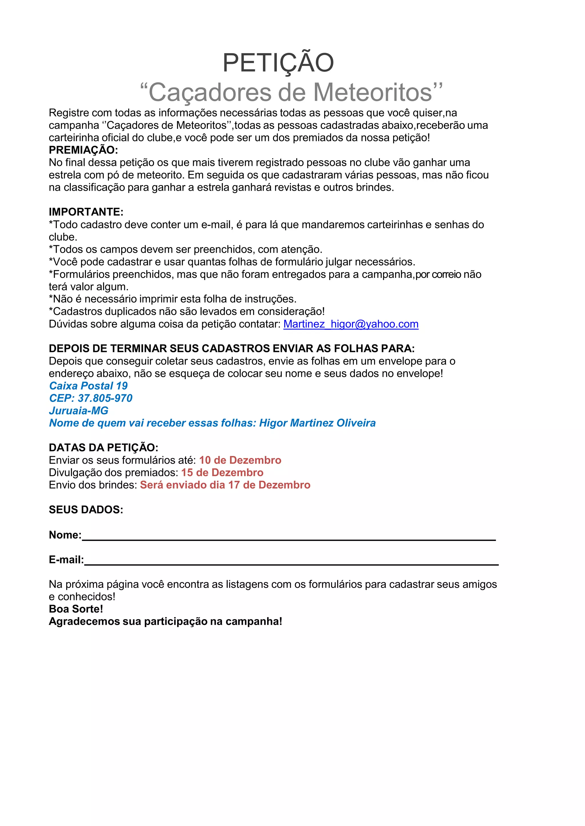 O documento descreve uma petição para o clube "Caçadores de Meteoritos", onde os participantes cadastram amigos e conhecidos para receber prêmios. Os que tiverem mais cadastros ganharão uma estrela de pó de meteorito e os demais receberão revistas. Os formulários devem ser enviados até 10 de dezembro e os prêmios serão distribuídos até 17 de dezembro.