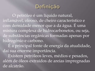 O petróleo é uma mistura de hidrocarbonetos que é a principal fonte de energia atualmente. No Brasil, a primeira sondagem foi realizada em 1892, mas só encontrou petróleo em 1938. A Petrobras foi criada em 1954 para monopolizar a exploração e refino de petróleo no Brasil e atualmente a bacia de Campos possui as maiores reservas do país.