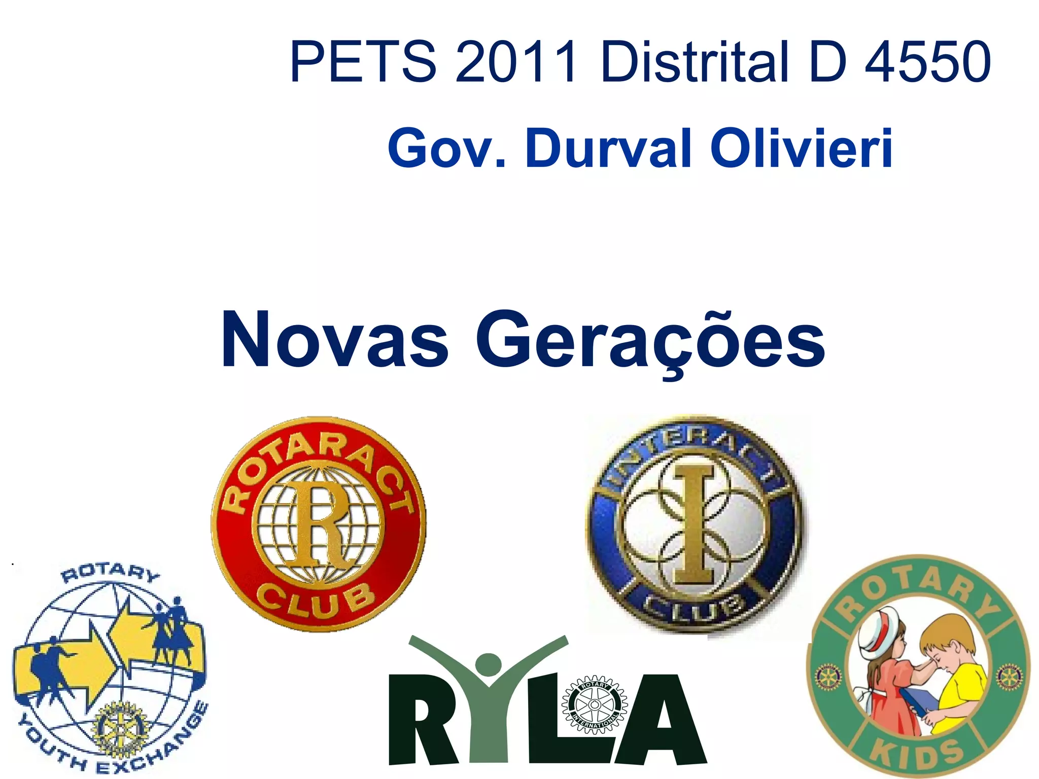 O documento discute vários programas de Novas Gerações do Rotary, incluindo Rotary Kids, Interact, Rotaract, RYLA e Programa de Intercâmbio de Jovens. Ele fornece detalhes sobre cada programa, como objetivos, participação atual no distrito e como aumentar a participação. O documento enfatiza a importância da colaboração entre esses programas e famílias para promover os ideais do Rotary entre os jovens.
