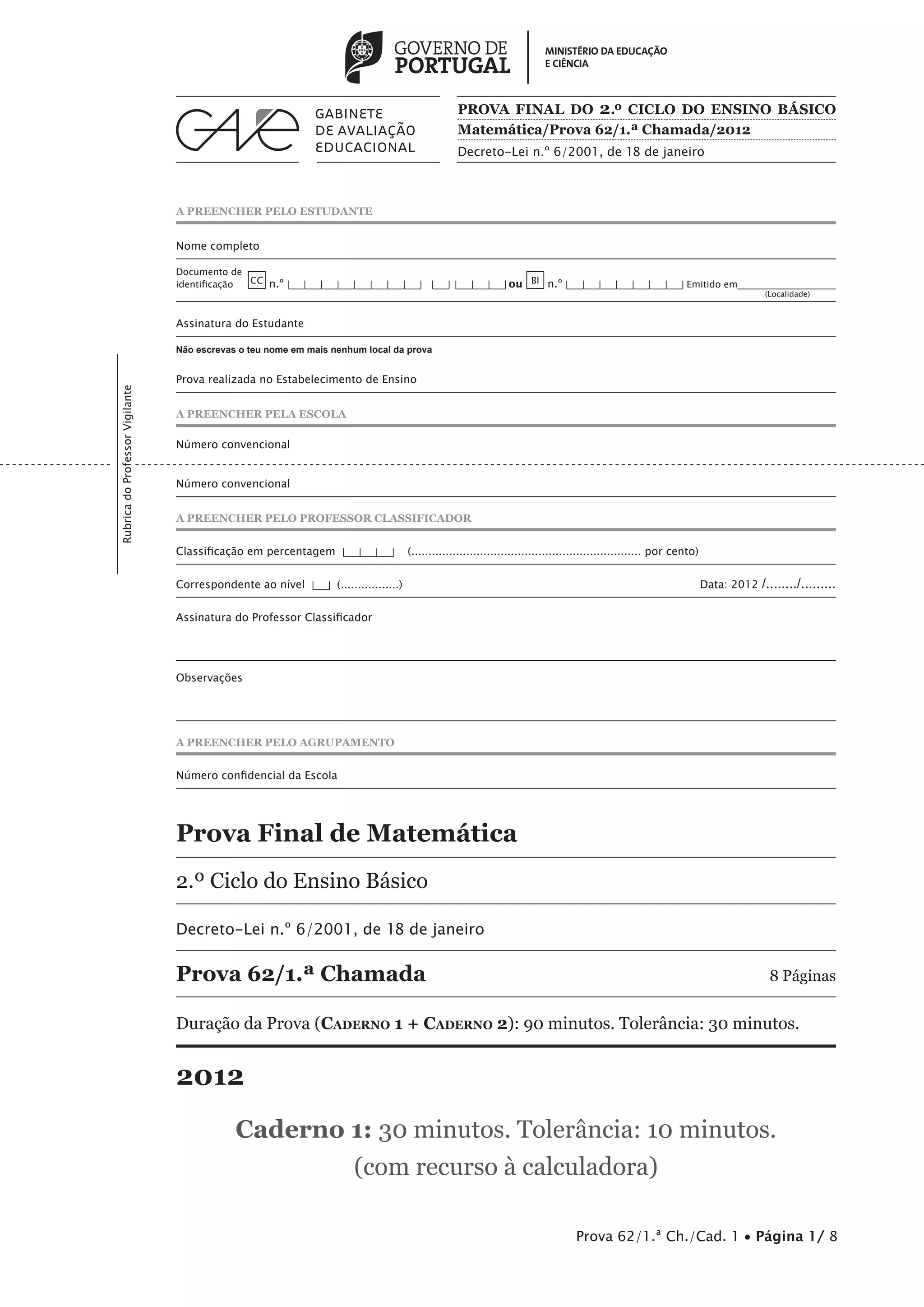 Caderno 1: 30 minutos. Tolerância: 10 minutos.