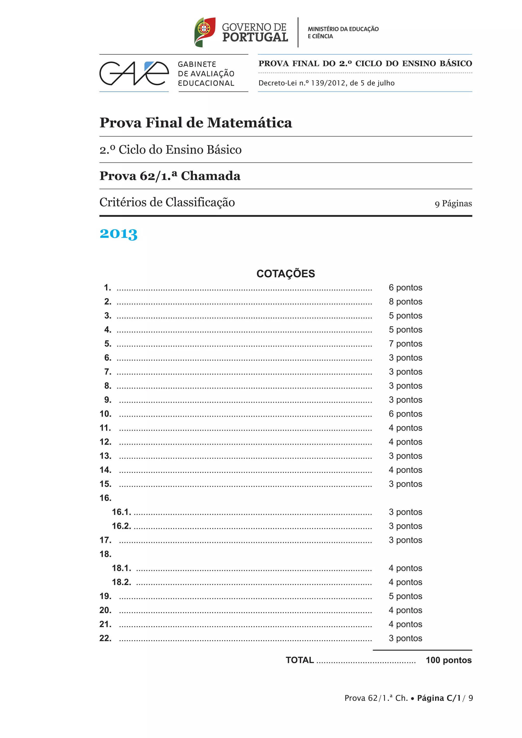 Este documento apresenta os critérios de classificação para uma prova final de matemática do 2o ciclo do ensino básico. Inclui critérios gerais de classificação e critérios específicos para 22 itens da prova, com diferentes níveis de desempenho e etapas de resolução. A classificação total da prova é de 100 pontos.