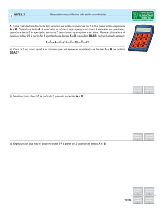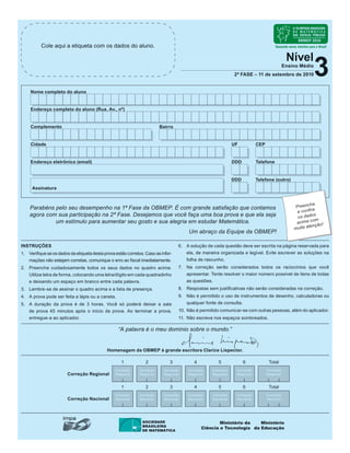 O documento apresenta instruções para a realização de uma prova de matemática da OBMEP, incluindo: preencher os dados corretamente, assinar a lista de presença, duração de 3 horas, soluções devem ser escritas de forma legível e organizada, não é permitido comunicação com outras pessoas.