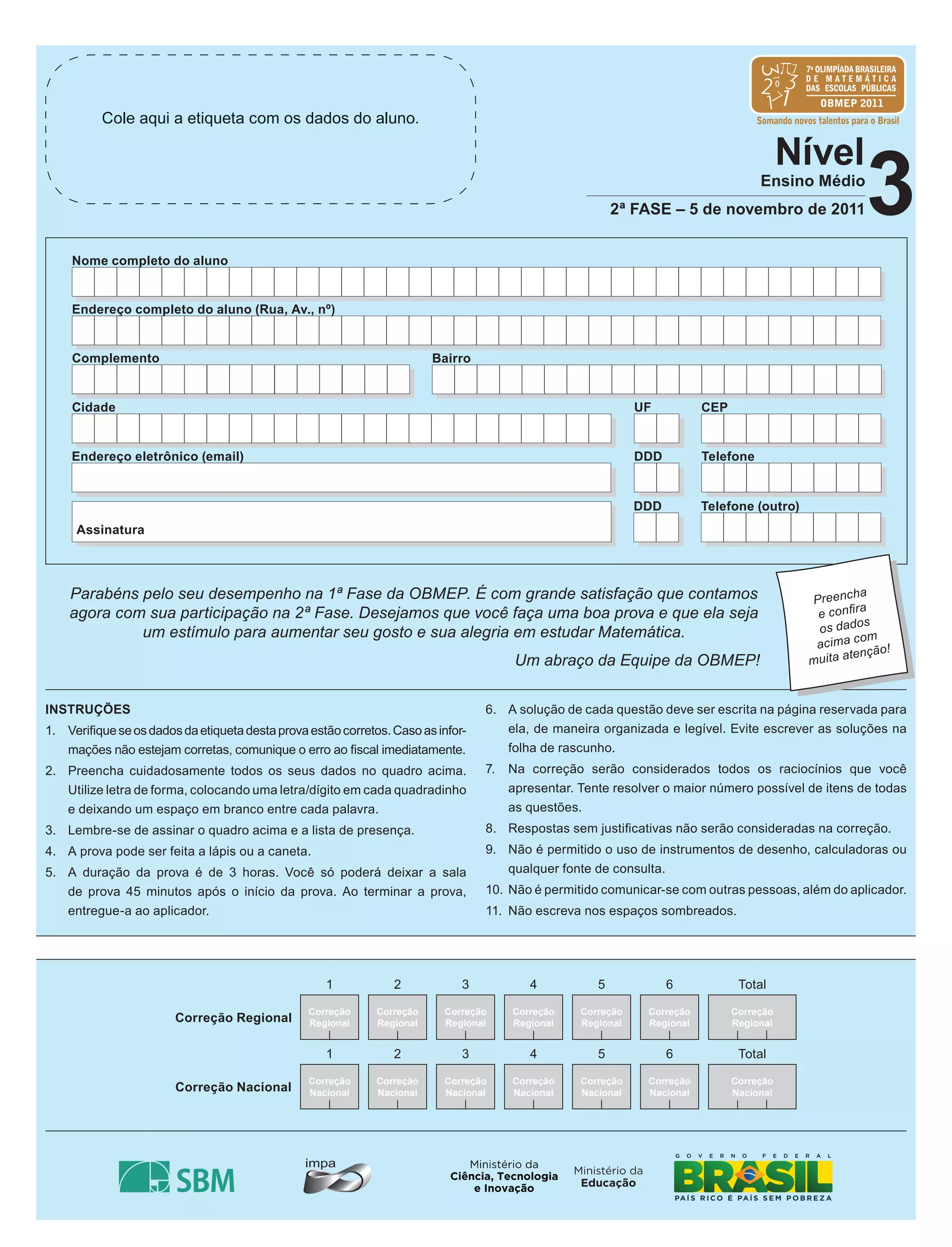 Este documento fornece instruções para a realização de uma prova de matemática, incluindo verificar os dados do aluno, preencher o quadro de identificação, assinar a lista de presença, durção da prova, não comunicação com outras pessoas e demais regras.
