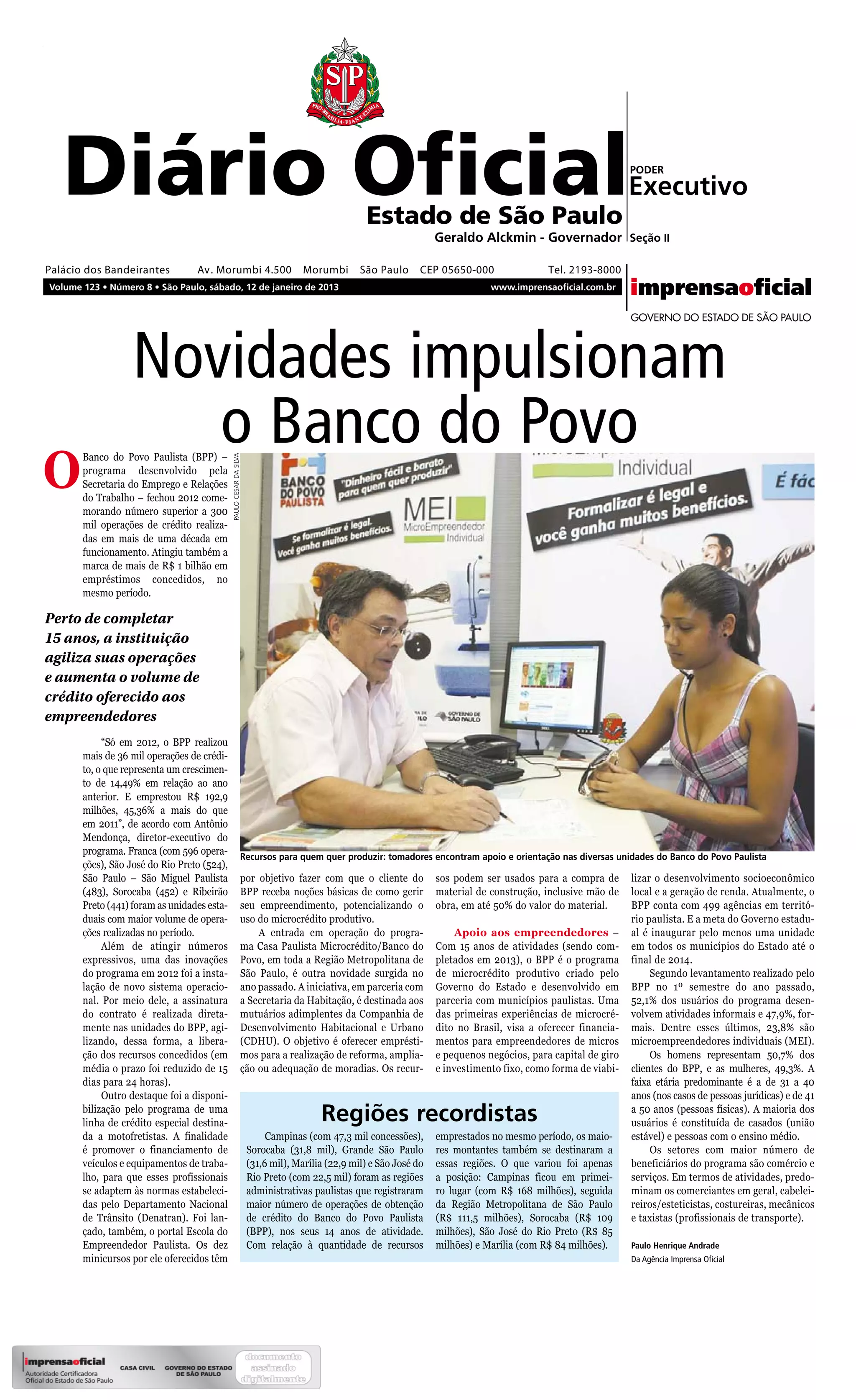 O Banco do Povo Paulista (BPP) atingiu marcas recordes em 2012, com mais de 36 mil operações de crédito e R$ 192,9 milhões emprestados. O programa também lançou novas linhas de crédito para motofretistas e reforma habitacional. Com 15 anos, o BPP é um dos primeiros programas de microcrédito no Brasil e tem como objetivo promover o desenvolvimento econômico local por meio de empréstimos a pequenos negócios.