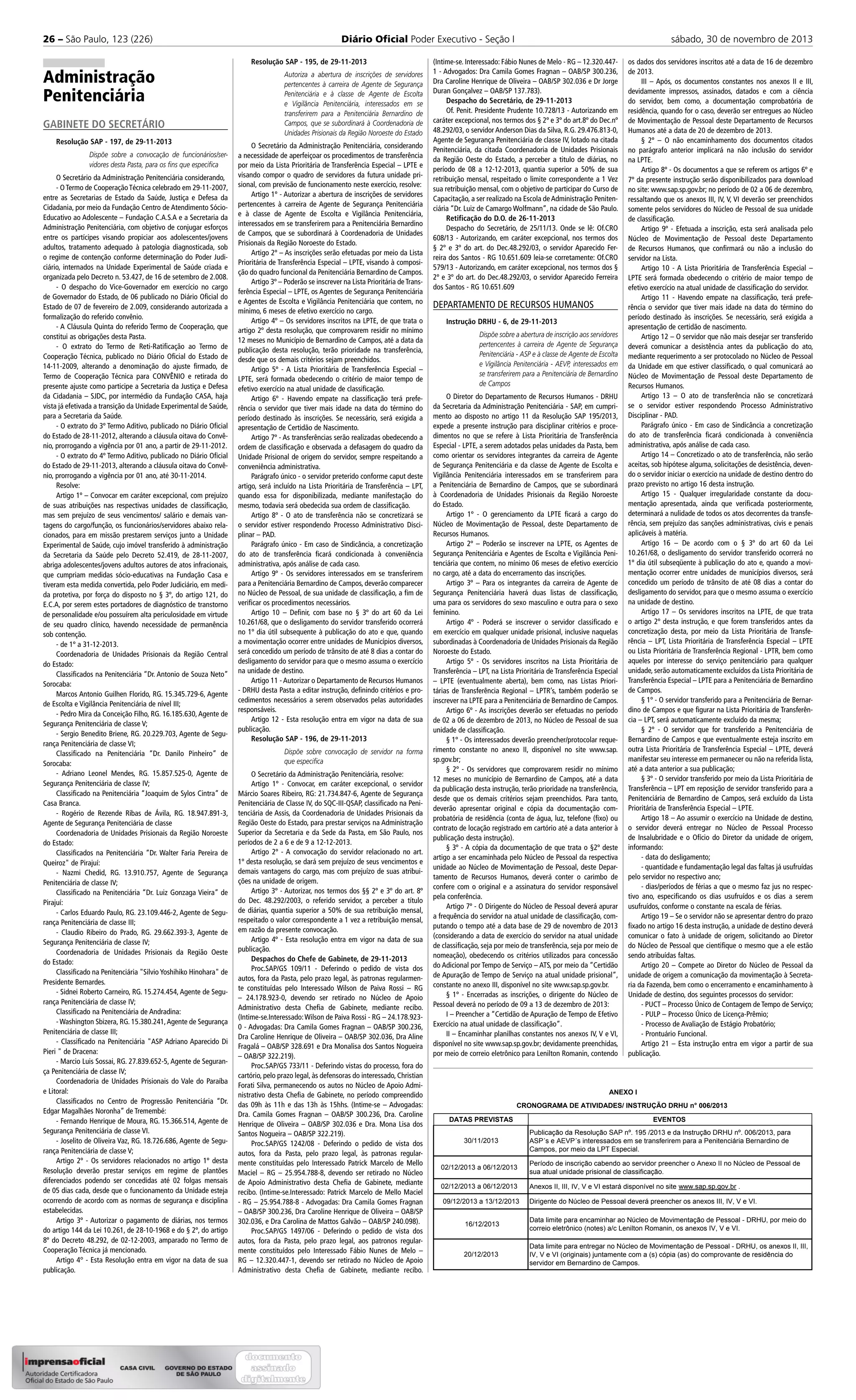 A resolução convoca funcionários/servidores da Secretaria da Administração Penitenciária para prestarem serviços em uma Unidade Experimental de Saúde que atende adolescentes e jovens adultos sob medidas judiciais. Além disso, autoriza o pagamento de diárias aos servidores convocados e abre inscrições para transferência de servidores interessados em trabalhar em uma nova penitenciária.