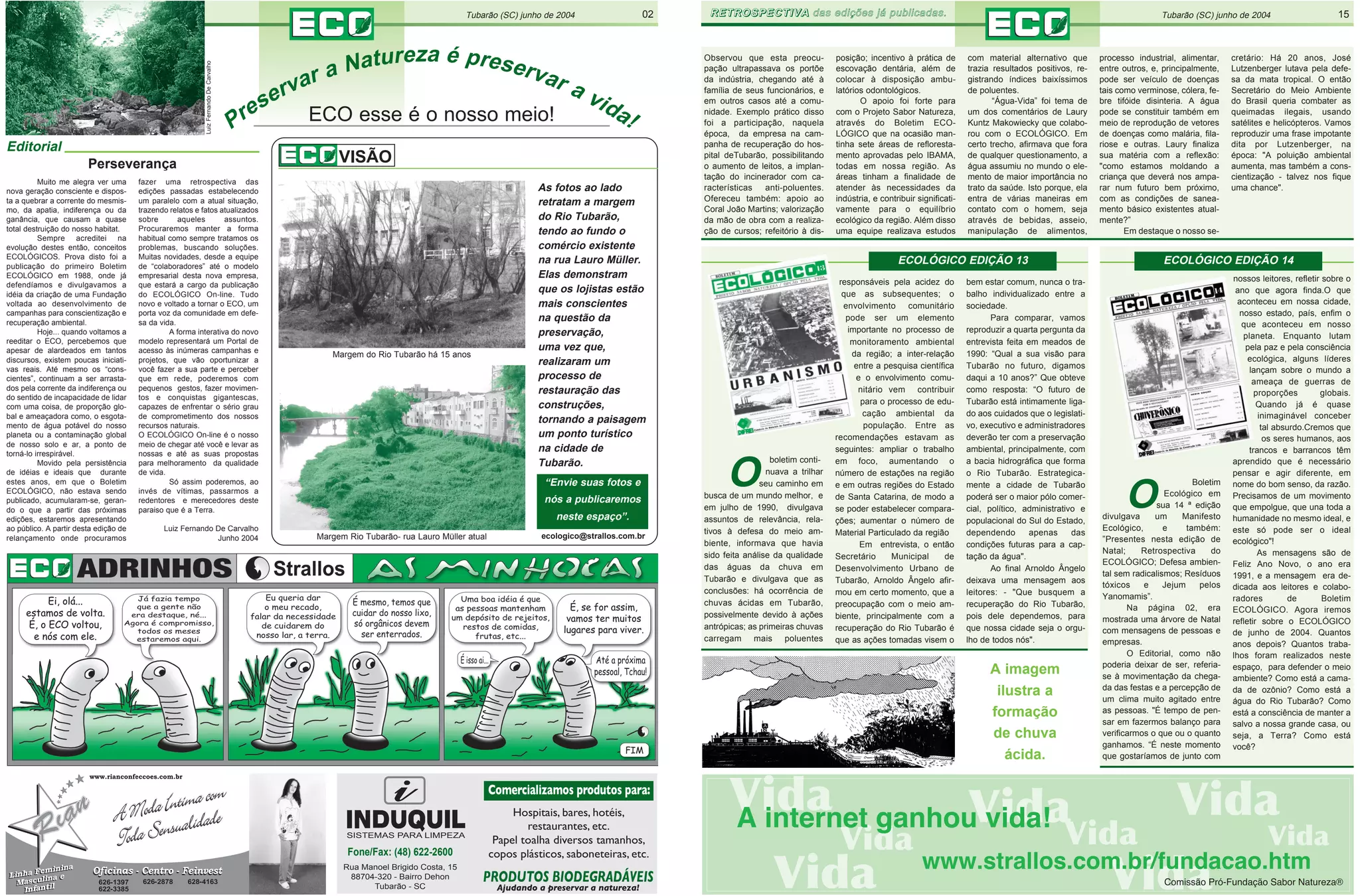 O documento resume edições passadas do boletim ECOLÓGICO, destacando assuntos relacionados à defesa do meio ambiente e à conscientização sobre a preservação dos recursos naturais na região de Tubarão (SC). A retrospectiva traz relatos sobre campanhas de recuperação ambiental na década de 1980 e 1990 e reflexões sobre os desafios atuais da sustentabilidade.