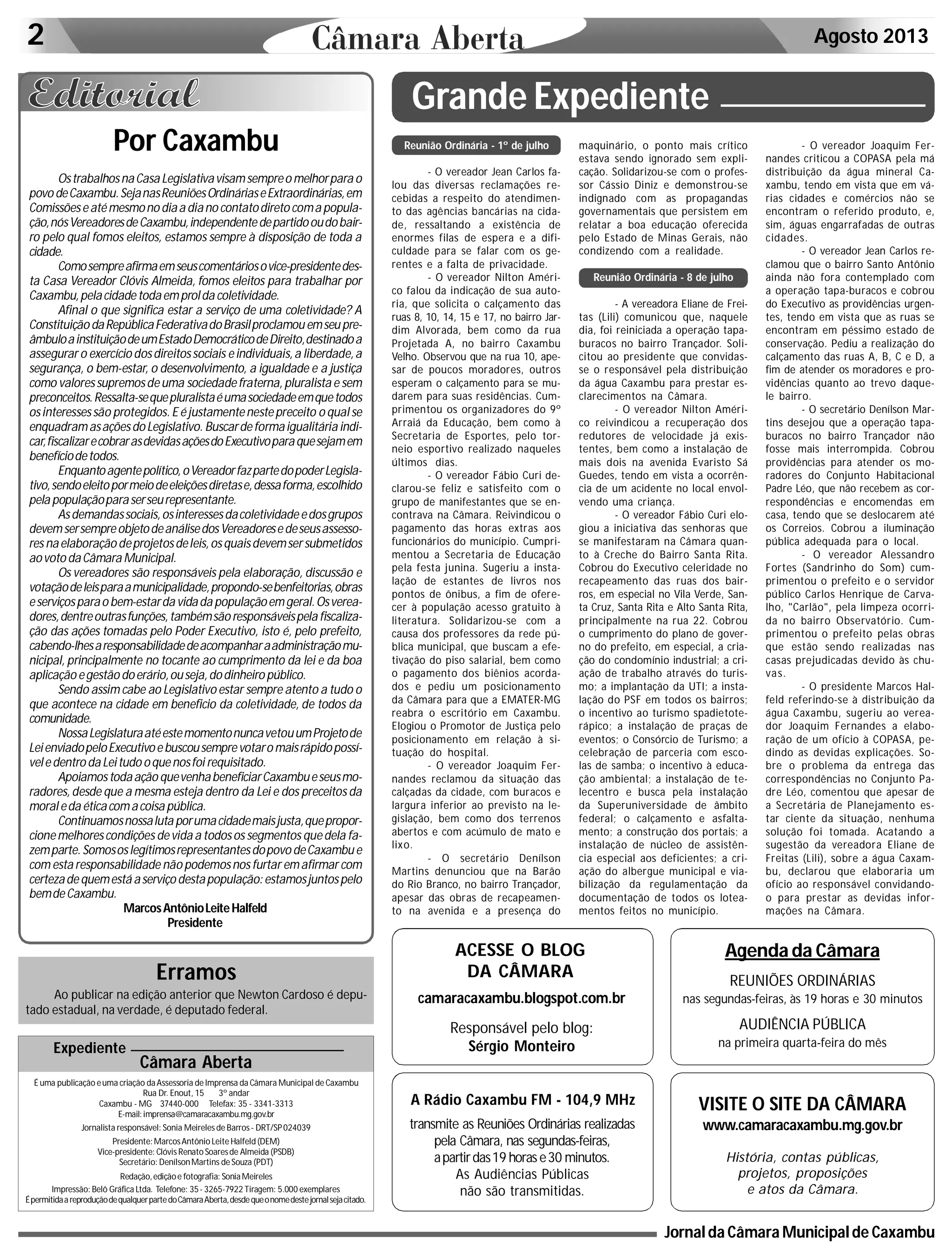 O documento é uma publicação da Câmara Municipal de Caxambu que resume as reuniões ordinárias de 1 e 8 de julho de 2013. Nelas, vereadores discutiram problemas locais como estado das ruas, distribuição de água e atendimento bancário, além de cobrarem soluções do executivo municipal.