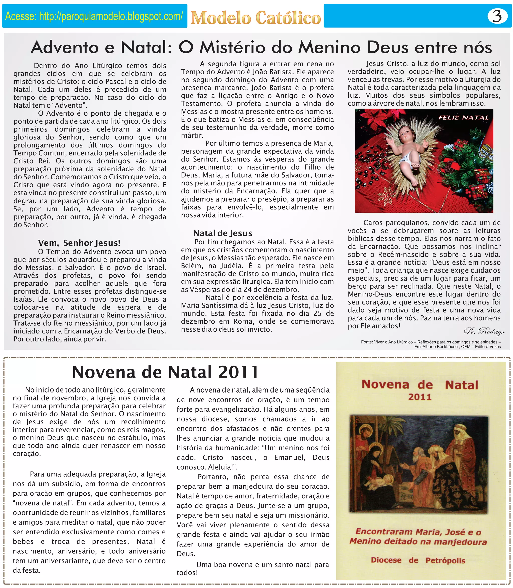 O documento descreve o significado do Advento e do Natal na Igreja Católica. Fala sobre as figuras de Isaías, João Batista e Maria na preparação para o nascimento de Jesus, e convida os leitores a participarem da Novena de Natal para renovarem seu coração para a vinda do Menino Deus.
