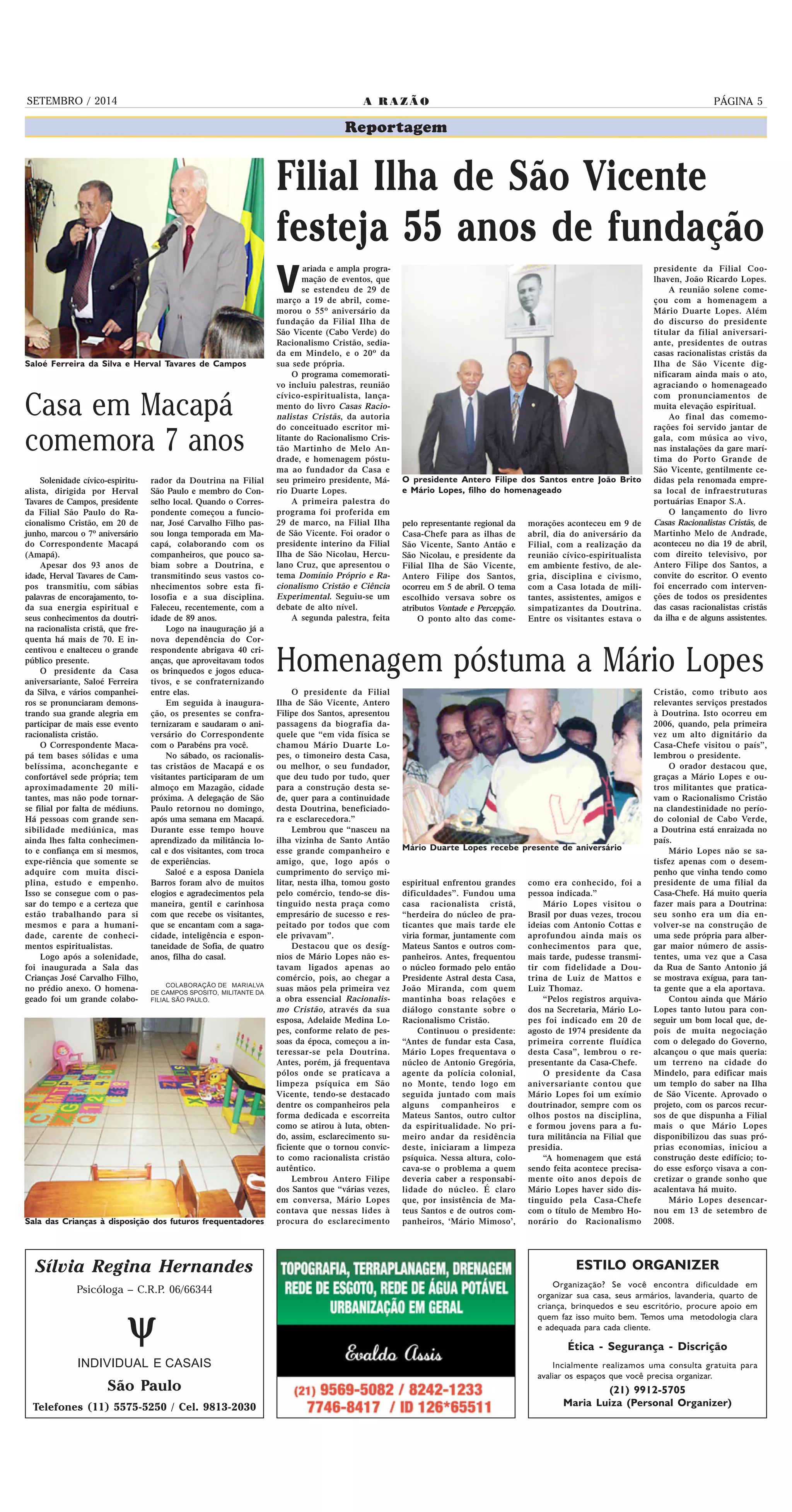 1) A Filial Ilha de São Vicente do Racionalismo Cristão comemorou 55 anos de fundação e 20 anos de sua sede própria com uma programação que incluiu palestras, homenagem póstuma ao fundador Mário Lopes, e lançamento de livro.