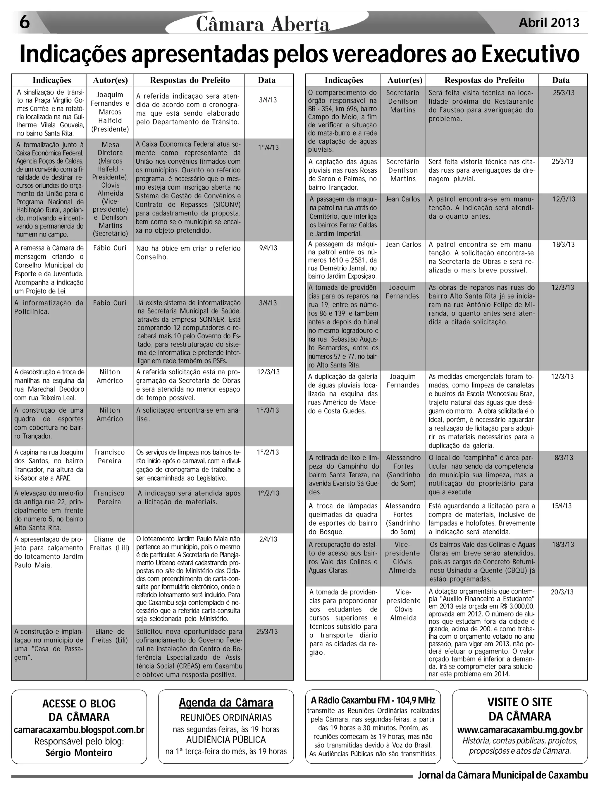 O documento é uma agenda da Câmara Municipal de Caxambu que lista as reuniões ordinárias e audiências públicas, informações sobre o site e blog da Câmara, transmissão das reuniões pela rádio local, e indicações apresentadas pelos vereadores ao Executivo com as respectivas respostas do Prefeito.