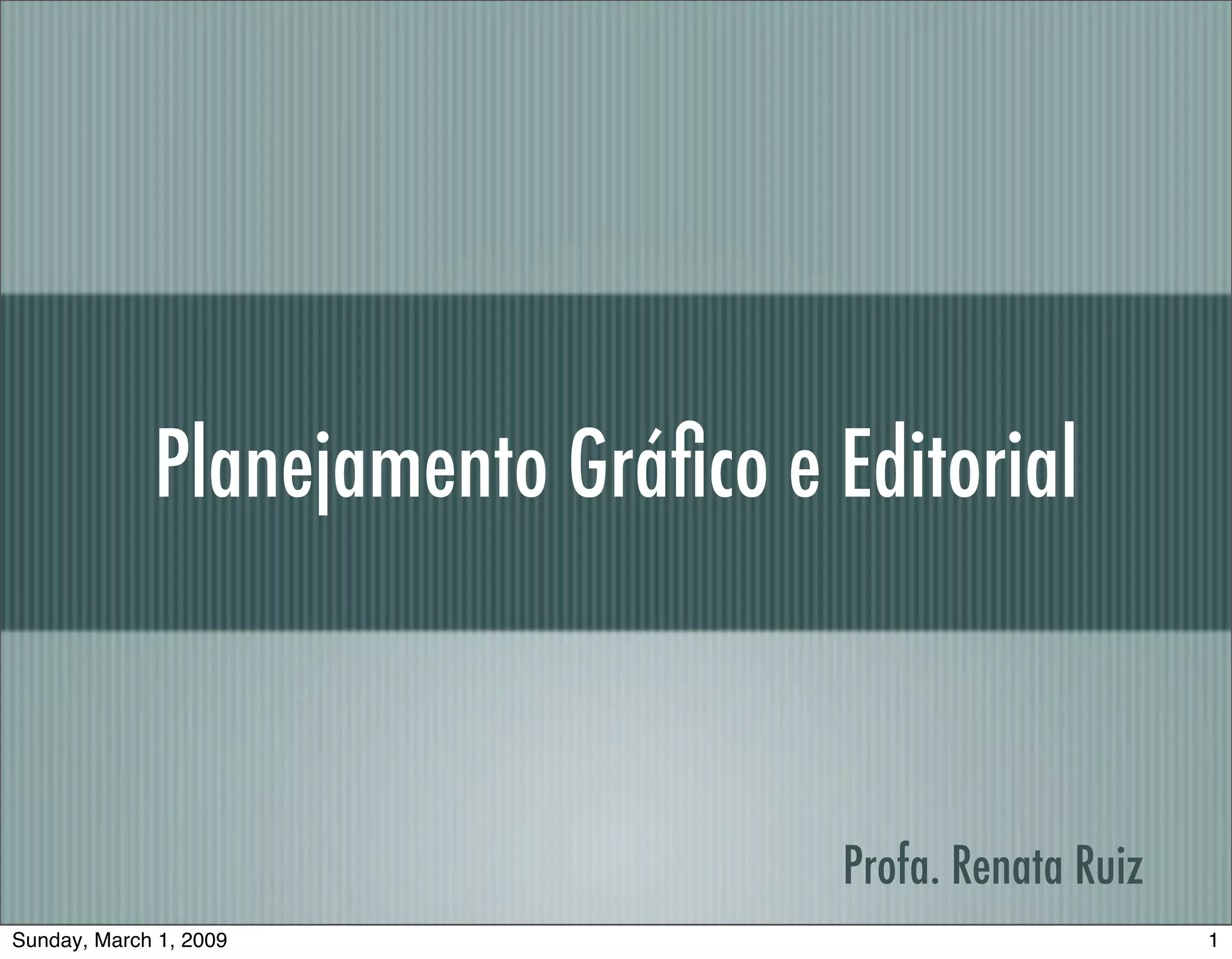O documento discute os conceitos de comunicação visual, planejamento gráfico e diagramação. Explica que a comunicação visual combina texto e elementos gráficos para produzir informação visual e orientar a leitura de forma agradável. Também destaca a importância da padronização gráfica para a identidade de veículos de comunicação.