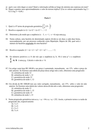 2. Os exercícios envolvem cálculos com termos, razões e equações de progressões geométricas.