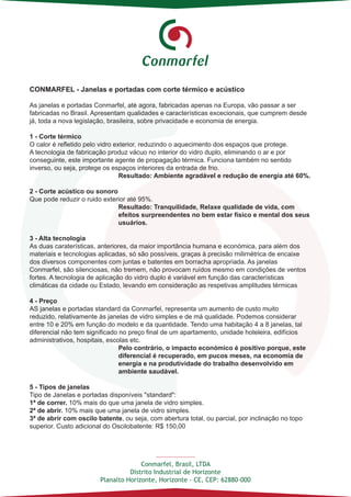 O documento descreve as janelas e portadas fabricadas pela Conmarfel no Brasil, que oferecem corte térmico e acústico, reduzindo o aquecimento e ruído em até 60% e 95%, respectivamente. Essas janelas utilizam vidro duplo com vácuo no interior para isolamento e precisão milimétrica nos componentes. O custo adicional é de apenas 10-20% em relação a janelas simples, sendo recuperado rapidamente pela economia de energia.